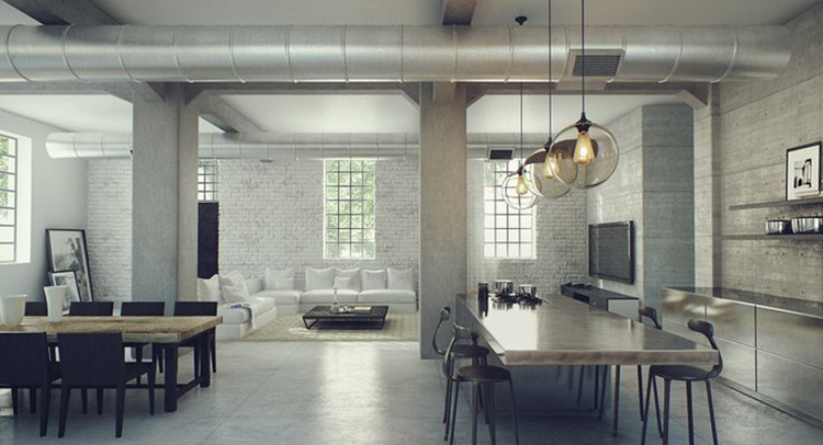 Il richiamo ai loft e agli open space newyorchesi degli anni cinquanta è d’obbligo. Lo spazio è fatto di linee nette e essenziali, ampie vetrate modulari dai profili metallici scuri. I materiali sono grezzi ma caldi, gli arredi sanno di vissuto e spesso sono pezzi di recupero in legno e ferro.  La struttura portante è lasciata a vista, così come tubi e condotte, le scale sono in ferro. Le pareti vengono lasciate grezze o vi sono mattoni di recupero a vista, magari tinti di bianco.