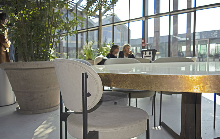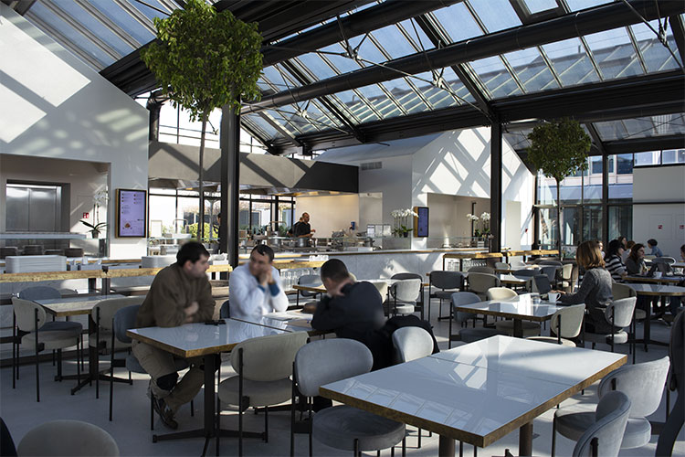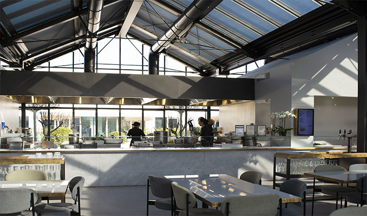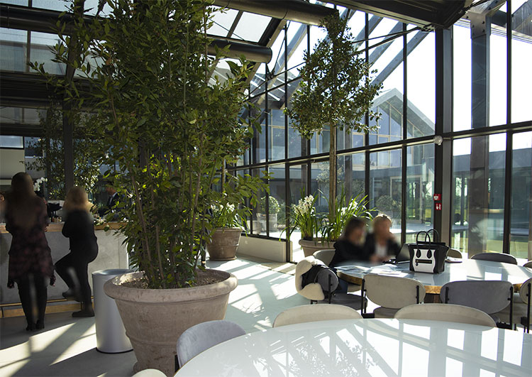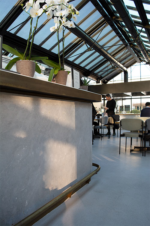 La serra centrale ospita il ristorante aziendale e un bar costituito da un bancone centrale come nei vecchi bistrot. Il rivestimento del bancone è in marmo grigio sabbiato, mentre il top è in pietra lavica con effetto crepatura.