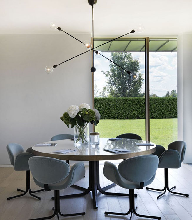 L’illuminazione nei vari ambienti è per lo più naturale, anche se l’attenzione ai corpi illuminanti non manca. Luci di design, in stile insustrial elegante, cromature nere e struttura a più braccia.