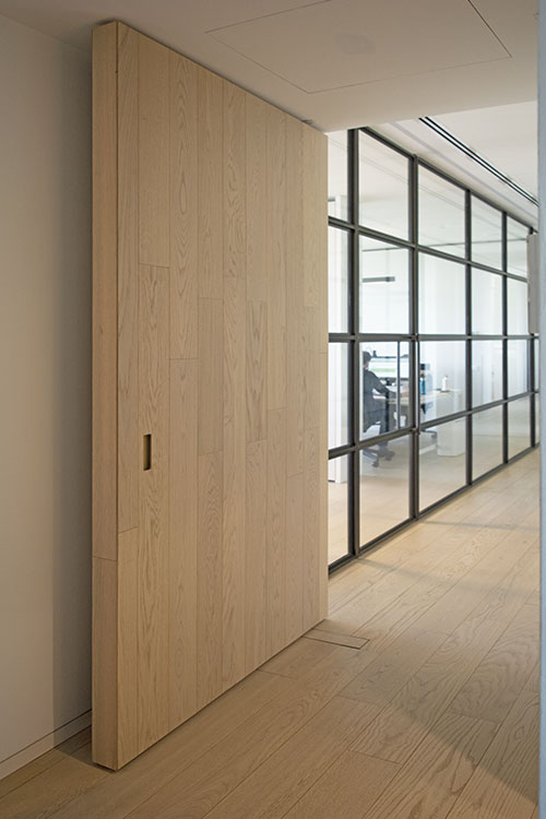 I materiali sono il legno nell’essenza rovere chiaro, il bianco dominante in tutti gli ambienti e il metallo nero delle aperture. Non mancano alcuni accenni di bronzo negli arredi.