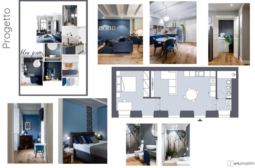 La palette colori scelta prevede le nuance del blu (freddo come quello dei jeans), del bianco e del grigio, accostati al caldo legno. I materiali scelti prevedevano il parquet in rovere, anche in bagno e rivestimenti ceramici in cucina e bagno, bianco a mattoncini nella prima, una piastrella effetto denim per la parete dei sanitari e lavabo e una piastrella 120×140 cm effetto wallpaper nella doccia walk-in.